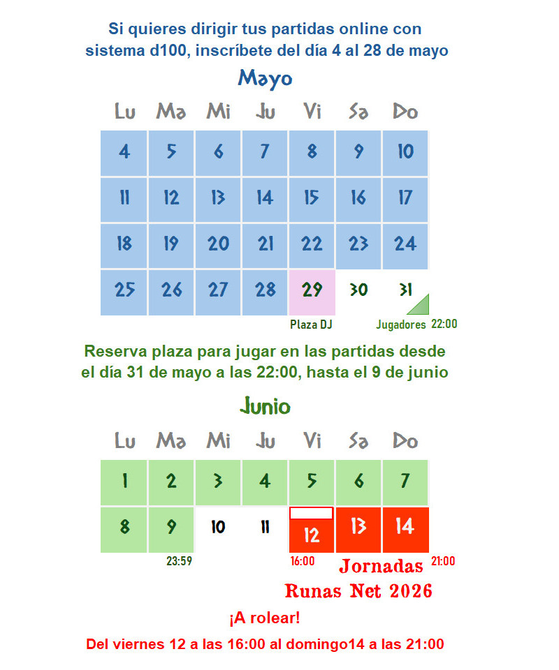 Podréis proponer/inscribir vuestras partidas desde el 4 de mayo al 28 de mayo (ventana de 3 semanas y 4 días). Entrad al Discord de las Runas Net.